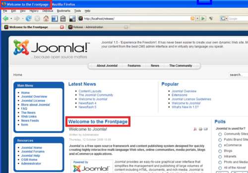 There are two places where the page title is displayed. The page title will always appear in the upper left corner of the browser bar and the page title can appear on the actual Joomla! Web page. The same value is always used for the page title whether it prints on the browser bar or the Joomla! Web page.